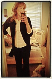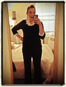 I’ve been at the same job for almost 6 years and have rocked the same dress code for that entire time. Half of my wardrobe is black pants, white collared shirts, and black sweaters and tops. I’ve worn the same thing 5 days a week for an incredibly long time. That all changes next week. No more black pants. No more black sweaters. No more black shoes. No more black anything. In one week, I will probably not even think about wearing the clothing that currently takes up half my closet. So, to celebrate the last week of black and white, I’m taking a picture every day before I head off to work. Here’s the one from today! I’m so excited!!