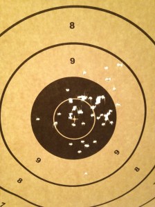 Then, he let me unload an entire box of ammo (about 50) into my own target to see how I was doing. Every single shot made it onto the target and the majority made it into the inner circle. I told my mom all that time playing Duck Hunt would pay off someday.