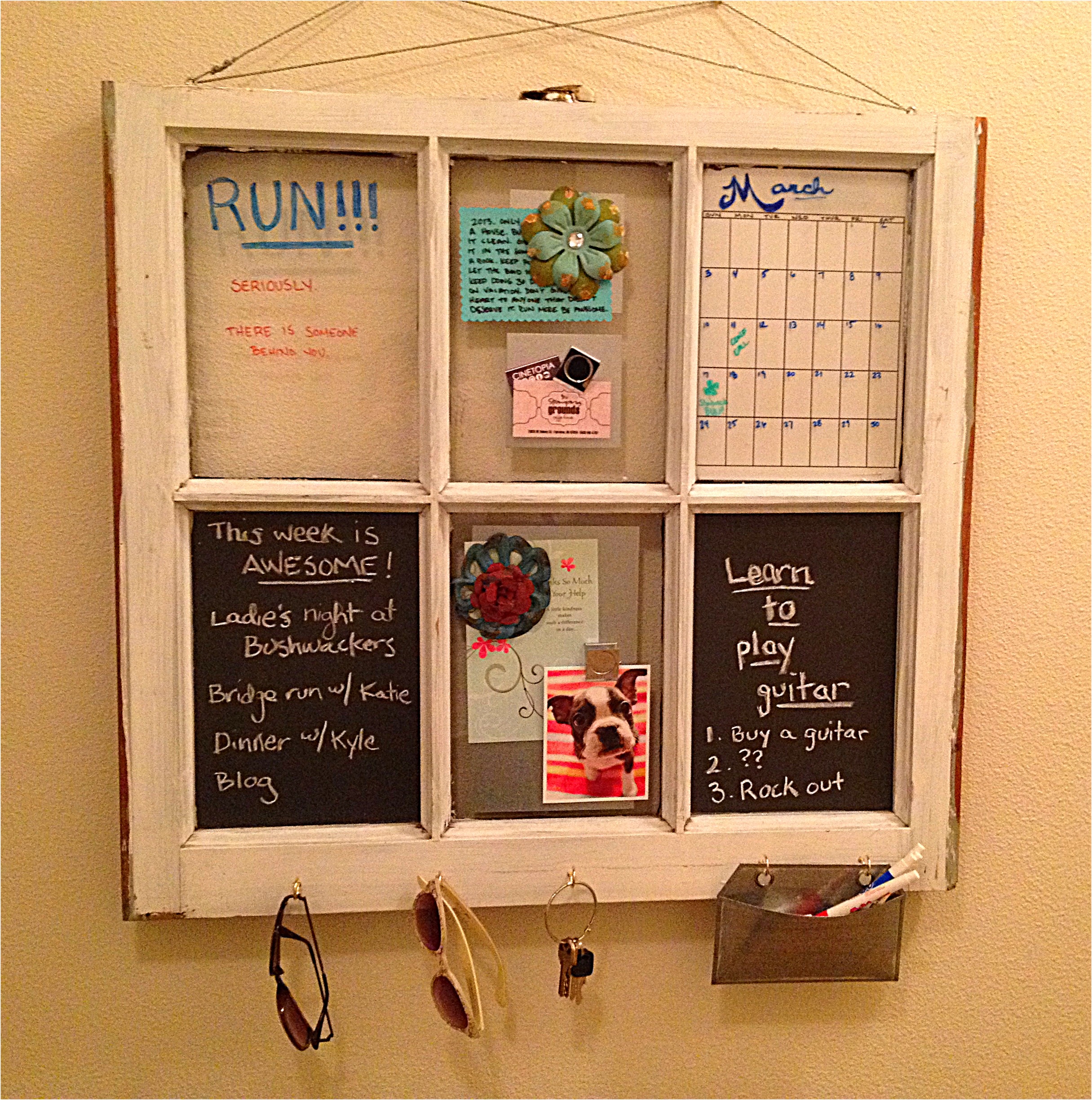 There are 6 panels on the window, so I was going to use the actual window panes for dry erase markering.  I cut out the exact shape of the pane in the chalkboard paper and stuck it right on.  I glued the metal strips directly to the window.  I made a blank 5 week calendar and taped it on the back of the window panel, this way I can write directly on the window and erase or change easily.  I found random hooks in my toolbox and screwed them to the bottom of the frame.  I also had to install the wire hanger, which was also in my toolbox, but you can get at Home Depot.  Done-zo!
