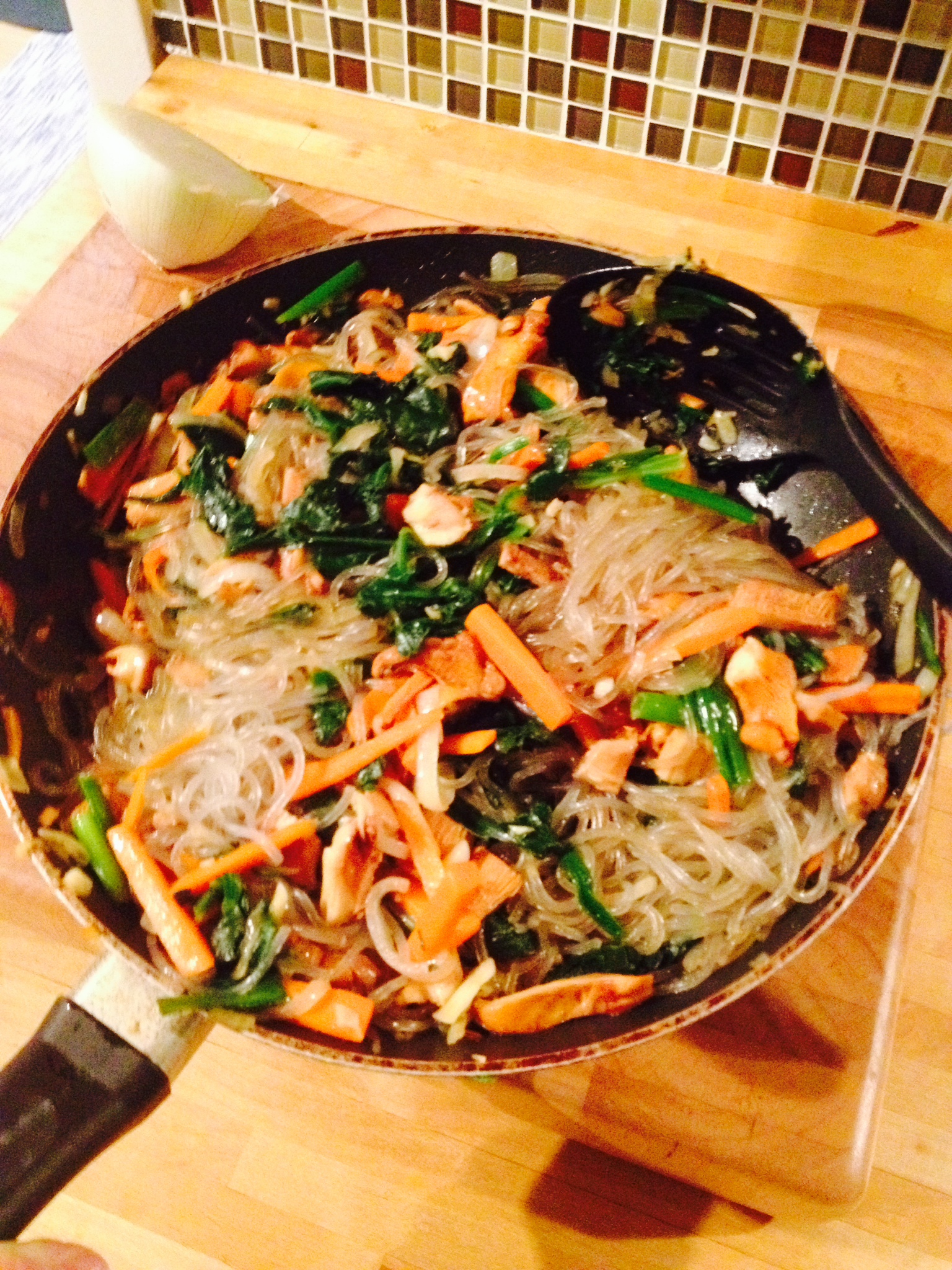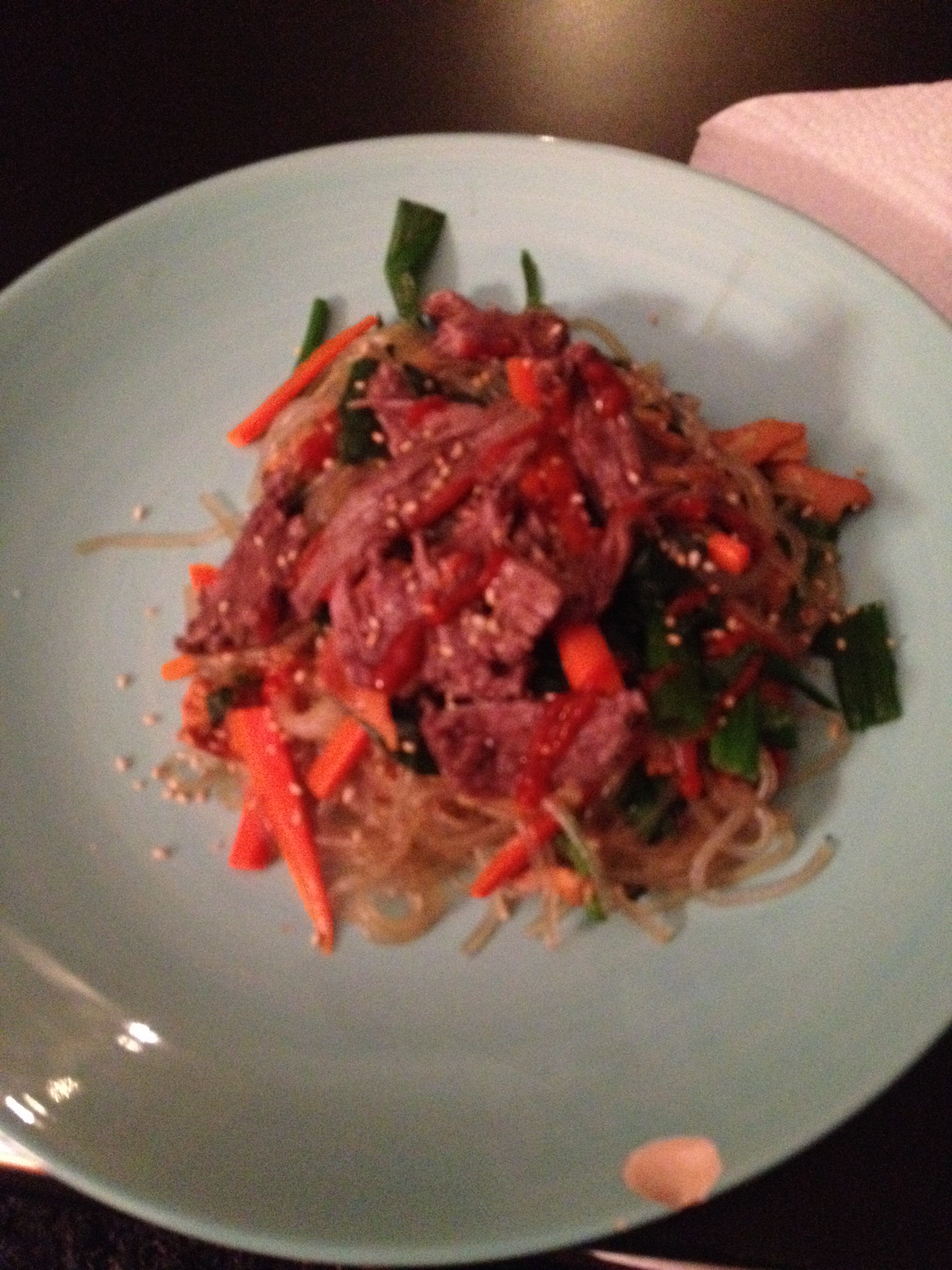 It’s a pretty basic Korean stir fry with noodles, beef, mushrooms, carrots, spinach, soy sauce, and sesame sauce.